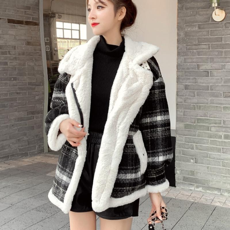 Autumn And Winter Long Sleeve Double Pocket Plaid Furry Coat Women